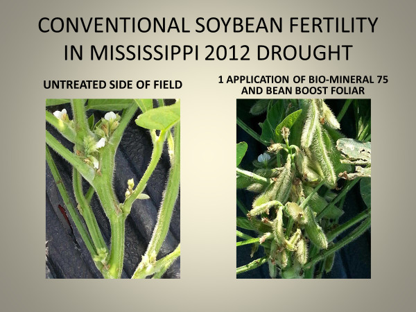 In 2012, we had the opportunity to run a comparison test on some soybean fields. We had proven the products and methods previously, but this farm needed to see for themselves what a difference our foliar nutrition could make. Both sides of the field received the same base fertility program, and the same amount of water. On one side, we added a trace mineral foliar application on the young plants. Shortly after our application, the rain stopped and Mississippi had one of their worst droughts on record through that growing season. We expected to see a difference in the treated side of the field, but we were surprised at the scope of that difference.