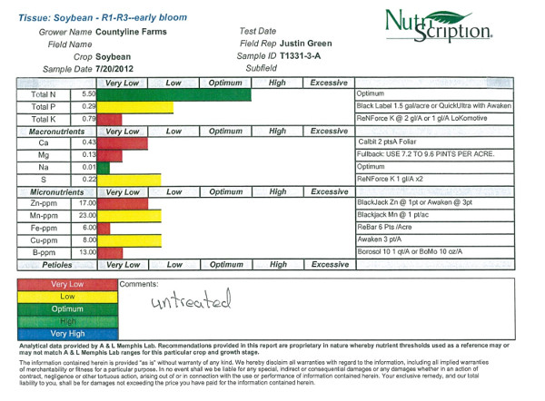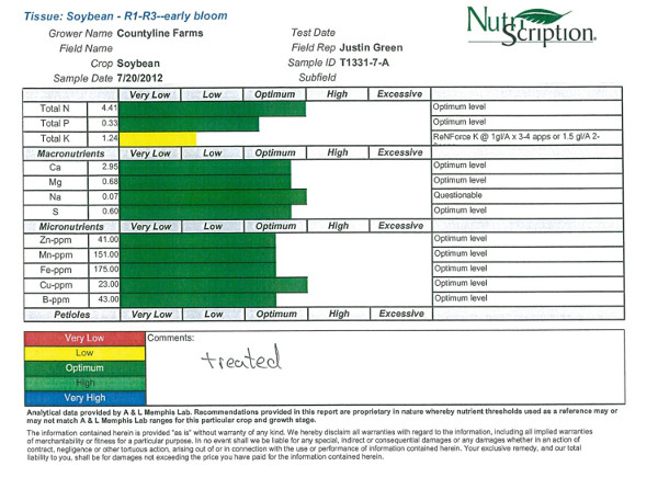 The plants from the untreated side of the field were either Low or Very Low in almost all of the nutrients examined. However, the plants from the treated side of the field rated Optimum in almost all nutrients. And the only reason Potassium was low was because they didn't apply the Potassium supplement we sent them.