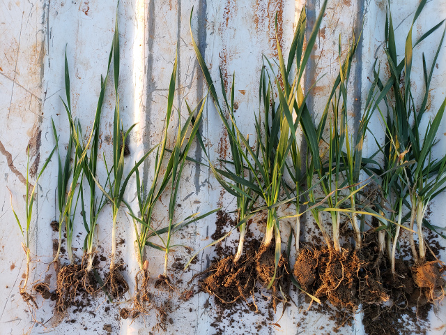 This example also comes out of Montana. When they planted dryland winter wheat last fall, they treated half of the seed with our seed treatment protocol and the other half with the local coop products. We went up in the spring (early May) and checked the seedlings and this is what we found. The plants on the left are the coop seedlings. The plants on the right were treated with the Bio Minerals Technologies seed treatment.