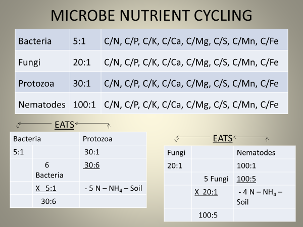 A protozoan with a C to N ratio of 30:1 has to maintain 30 Carbons and 1 Nitrogen in order to maintain its homeostasis. In acquiring the 30 carbons it must eat 6 bacteria (5:1). In doing so, it now contains 6 nitrogens but can only keep 1. The protozoa must excrete 5 nitrogen molecules back into the soil (as NH4-ammonium). Not only is the protozoa ‘mineralizing’ nitrogen, it is mineralizing P, K, Ca, Mg, S, Fe, Zn, Cu, B, Co, Mo, Mn, and many more mineral nutrients. This pattern is repeated over and over, many thousands of times a day by each of these active and functioning microorganism groups living in the soil.