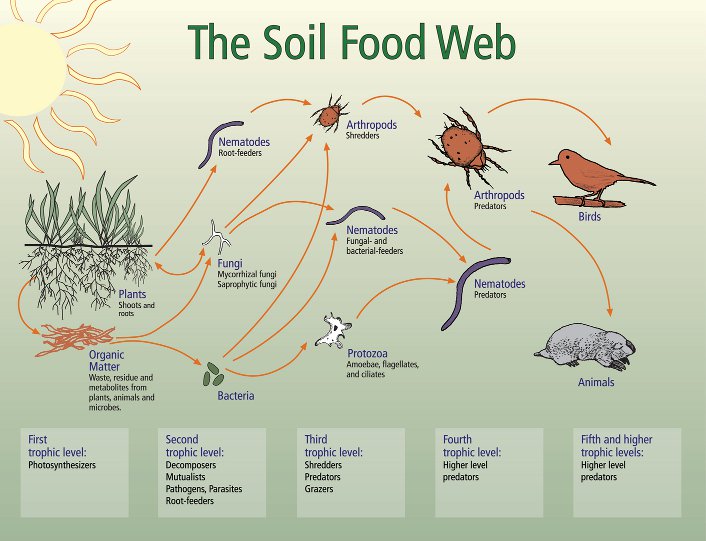 Each organism species, bacteria, fungi, protozoa, nematode, micro-arthropods, macro-arthropods (also known as shredders), earthworms, gastropods, and on up have a different Carbon (C) to Nitrogen (N) ratio. This allows for the nutrients held in one species to be released when eaten by another species. Bacteria are the most nutrient dense living organism on this planet with a general C to N ratio of 5:1. Fungi ratios average 20:1, protozoa 30:1 (just like us humans), nematodes 100:1, and micro/macro-arthropods upwards of 150:1. Bacteria and fungi are the decomposers. The predatory microbes are the protozoa and nematodes and they eat bacteria and fungi primarily. Shredders being micro/macro-arthropods tear apart the organic matter to get to their food sources, the fungi, protozoa and even nematodes. Earthworms will eat just about anything from organic matter, nematodes, protozoa, fungi and bacteria. Gastropods eat fungi, algae, lichens, fresh and rotting organic matter.