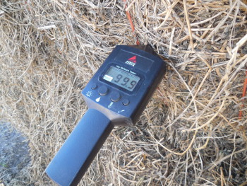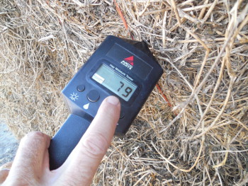Ken stopped at Toms place on August 28th on his way to Montana and took pictures of this stack of fermenting hay. As you can see the moisture is still above 45% as that is the limit on the probe. The temperature was at 79 degrees and the stack had a pleasant fermentation smell.