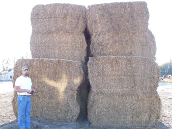 The hay was baled August 15th, ( Friday ) and it was baled up wet (well over 40% moisture) and moldy. Ken told Tom he could expect the temperature inside the bales to climb until the culture’s beneficial microorganisms had time to take over the interior environment and kill the pathogens (the mold and other toxins). The heat inside the hottest bale peaked Monday the 18th at 151 degrees (the highest temperature we had previously seen was 139 degrees on another farm in Utah, but it was not spoiling either). Tom was very worried that the hay would keep heating and eventually catch on fire. Tuesday morning Tom called and said the temperatures were falling in all the bales and the hottest bale was now 119 degrees.  This is what Tom wrote Ken about the hay in the pictured stack.